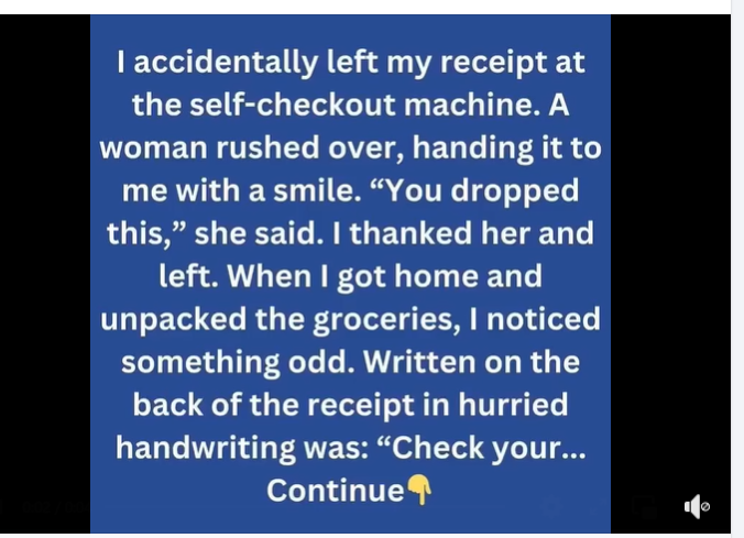 I accidentally left my receipt at the self-checkout machine. A woman rushed over, handing it to me with a smile. “You dropped this,” she said. I thanked her and left.