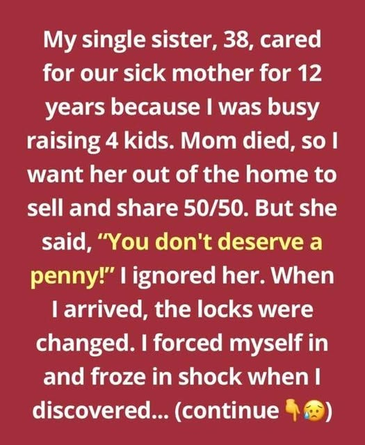 My single sister, 38, cared for our sick mother for 12 years because I was busy raising 4 kids. Mom died, so I want her out of the home to sell and share 50/50. But she said, “You don’t deserve a penny! You were not a devoted daughter!”