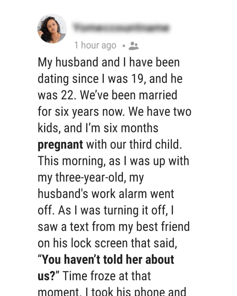 An anonymous Reddit user shared a devastating story about discovering her husband’s affair with her best friend while she was six months pregnant. Married for six years with two children, the woman had been navigating the loss of her father, diagnosed with terminal colon cancer. Her husband had been a supportive rock during this difficult time, but everything changed when the woman found a text from her best friend on his phone, revealing the affair that had been ongoing for four months.