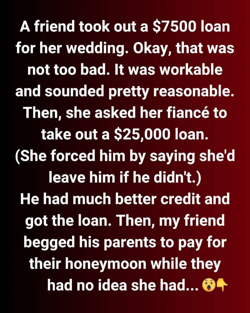 He had much better credit and got the loan. Then, my friend begged his parents to pay for their honeymoon while they had no idea she had asked their son to take out a loan.