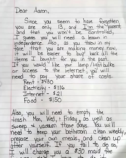 Her letter was a direct response to her 13-year-old son. Johnson called him out for treating her like a “roommate” rather than a parent. To drive her point home, she presented him with an itemized bill for rent, food, and other expenses totaling over $700—essentially showing him what life would be like if he truly wanted to live independently.