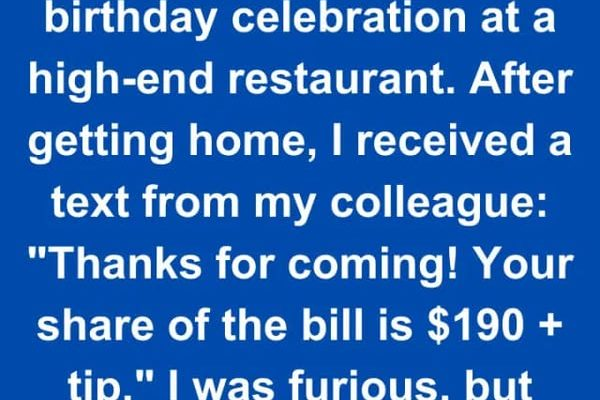 My husband and I were invited to my colleague’s birthday celebration at a high-end restaurant. After getting home, I received a text from my colleague: “Thanks for coming! Your share of the bill is $190 + tip.”
