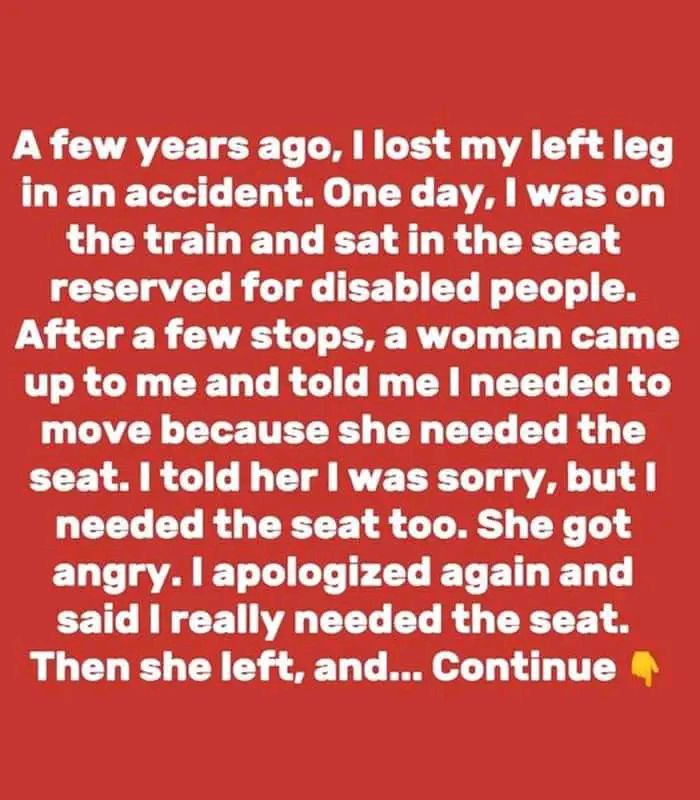 “I apologized again and said I really needed the seat. She left and brought back the train conductor, who also told me to move. At this point, I was tired of being treated this way, so I rolled up my pant leg, showed my prosthetic, and told them I wasn’t moving.