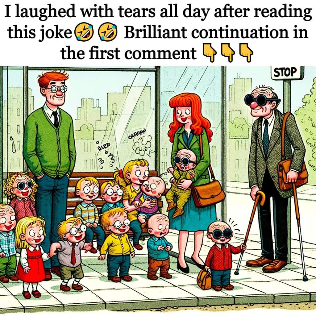 A husband and wife are waiting at the bus stop with their nine children. A blind man joins them after a few minutes.