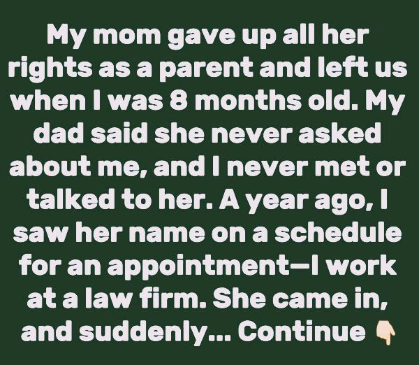 After she left, I looked through her file in the lawyer’s office. She was divorcing her third husband and wanted a good lawyer to get a lot of his money, which was in the millions. I was also surprised to learn she had two young daughters with him. Seeing her broke my heart, especially since she didn’t even recognize me. It just confirmed what my dad had told me—she had moved on and forgotten about me.