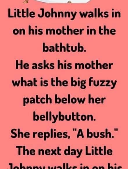 “Mom,” he asked innocently, “what’s that fuzzy patch below your belly button?” Caught off guard but staying calm, she gently replied, “That’s called a bush, sweetheart.”