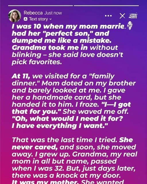 But days later, she knocked on my door — not to say sorry, but because she was desperate. Grandma had sent a final message to my half-brother Jason, revealing the truth: that he had a sister he never knew. That I existed. Now he was angry at her. And she came to me, asking me to fix it.