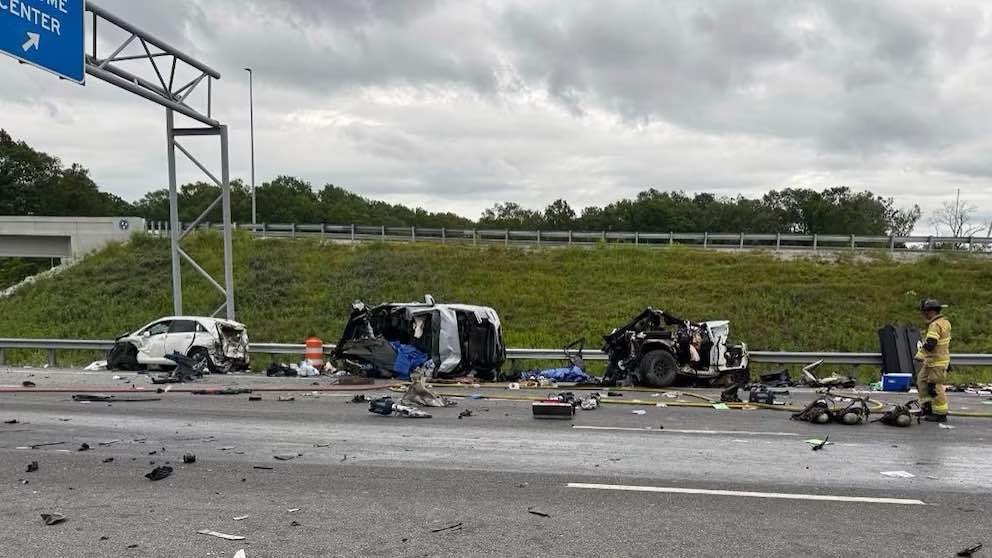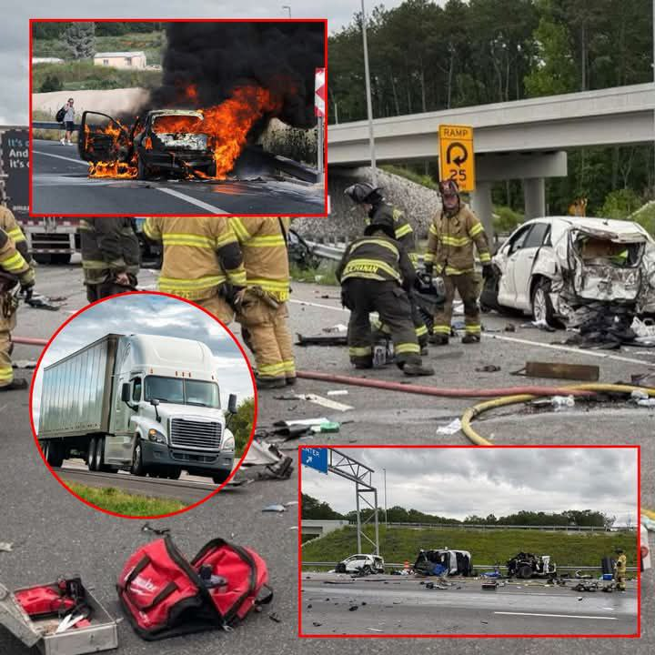 The incident involved six passenger vehicles and a tractor-trailer, with two vehicles “actively on fire” after the crash, according to officials.