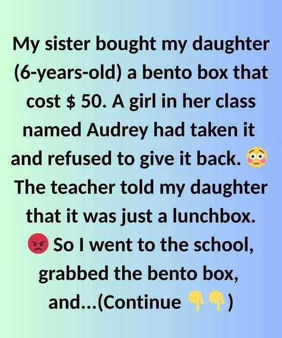 hoping for support, but was brushed off: “It’s just a lunchbox. Maybe it was a misunderstanding.” I was stunned. The next morning, I walked my daughter into school. Audrey showed up—carrying the missing lunchbox. I calmly asked the teacher to open it. Inside, my daughter’s name was clearly written in permanent marker. Audrey stammered. The room went quiet. The teacher turned red, trying to explain,