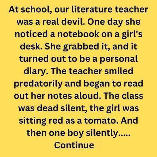It was her personal diary. A cruel smile spread across the teacher’s face. “Let’s see what’s so important it couldn’t wait, until after class,” she said, and began reading aloud. We all froze. The girl sat motionless, her face burning red, eyes wide with panic as the teacher recited her private thoughts like some twisted performance.