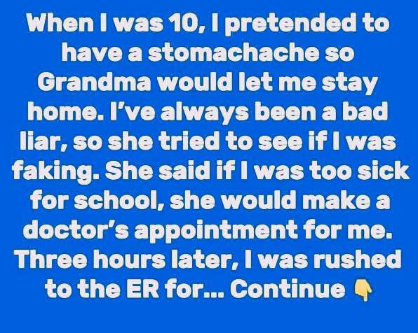 When I was a kid, I once pretended to have a stomachache just to skip school. I wasn’t a great liar, and my grandma — who was watching me that day — could tell something was off. Instead of calling my bluff, she calmly said, “Alright, if you’re too sick for school, we’ll just go to the doctor and get you checked out.” I panicked a little but stuck to the act, thinking I’d just get a free day at home.