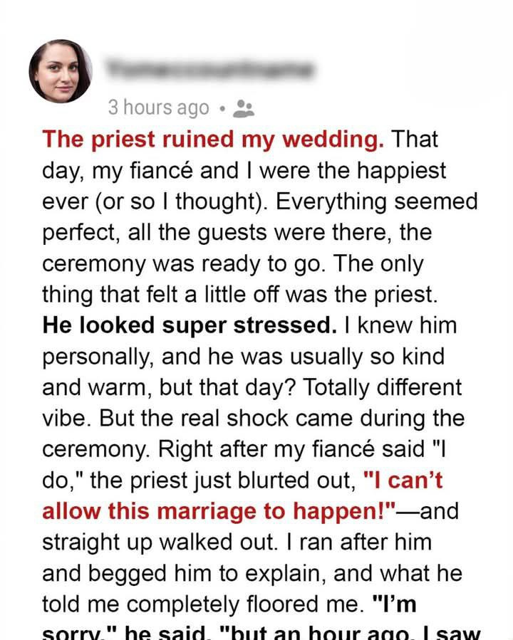 But just as we were about to be declared husband and wife, the unexpected happened. The priest, Father Benedict — a man who’d known me since childhood — suddenly closed his prayer book, looked me in the eyes, and said, “I’m sorry. I can’t allow this marriage to happen.” Then he walked out of the church. Shocked and confused, I ran after him, begging for an explanation.