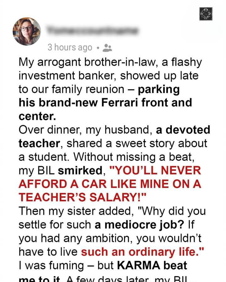 This year, he arrived late in a flashy red Ferrari, revving the engine until the whole family turned to look. As usual, he basked in the attention, bragging about the car’s cost, speed, and the bonus that bought it. At dinner, my husband David — a dedicated high school teacher — shared a moving story about one of his students who had overcome major odds to earn a scholarship.
