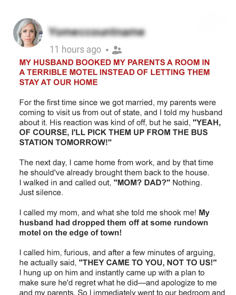 His cold reasoning? “They came to see you, not us.” Furious and humiliated, Clara realized this wasn’t just about the motel — it was about all the silent sacrifices, the daily efforts that went unseen, and a marriage that had been running on autopilot far too long. As she stood in their quiet home, something inside her shifted… and that’s when she made a bold decision that would shake everything up.Clara packed a bag, calmly listed out all the tasks Tom would now be responsible for, and walked out the door — straight to the motel where her parents were waiting. But she didn’t stop there. She moved them to a warm, welcoming inn and spent the next few days simply being a daughter again — laughing, listening, and remembering who she was outside of housework and compromise.