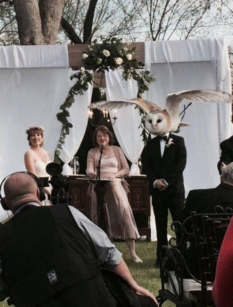 This isn’t the tale of the forbidden love between a woman and an owl-man. This is just a perfectly-timed picture of an owl photobombing a lovely wedding. Go home, owl, this isn’t your big day.