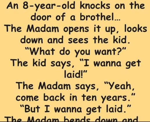 An 8-year-old knocks on the door of a brothel… The Madam opens it up, looks down and sees the kid. “What do you want?” The kid says, “I wanna get laid!”