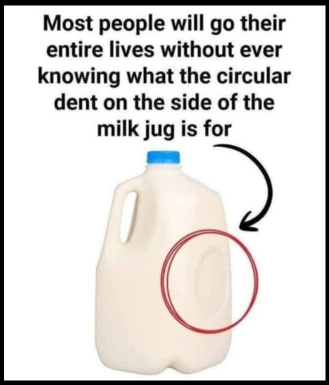 without ever knowing what the circular indent on the side of the milk jug is for.” According to one Facebook user, Cory Anderson, “the milk is going bad whenit pops out.” According to a different social media user, the indent may be related to the carton’s capacity to expand in cold weather. According to Andrew