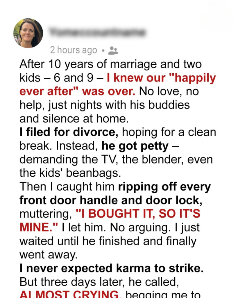 When Alice divorced her husband Mike after ten years of marriage, she expected some tension—but not the pettiness that