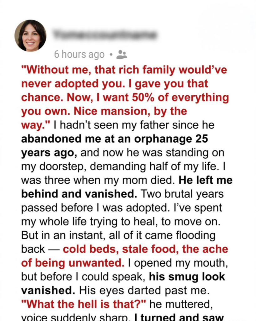 I had just put my 4-year-old down for a nap when someone slammed the doorbell like they were trying to break it. I opened the door to find a weathered, intimidating man staring back at me. He looked rough, like life had chewed him up and spit him out. Then he said something that froze me in place: “Emily. It’s me. Your father.” I hadn’t seen this man in over 25 years—and I had no memory of him. He was just a shadow from a painful past I’d long tried to forget. And now here he was, standing on my doorstep, not to apologize, not to reconnect—but to demand something. “I want half,” he said