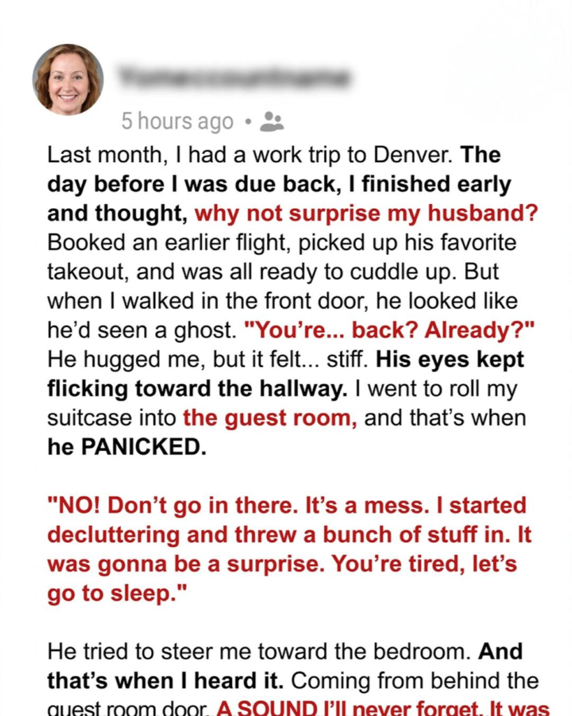 laughing into his gaming headset, not even pretending to care. I wanted a baby more than anything. I worked harder, traveled more, and kept chasing promotions, thinking we were building a future. But the truth was, I was doing it alone. Three months later, I surprised him by coming home early after landing a major client. There was a small pink bicycle on our porch. Inside, I was greeted by a nervous Matt and a locked guest room. Then came the sound—a child’s giggle. I opened the door and found a little girl playing with stuffed animals. “Are you the evil witch?”