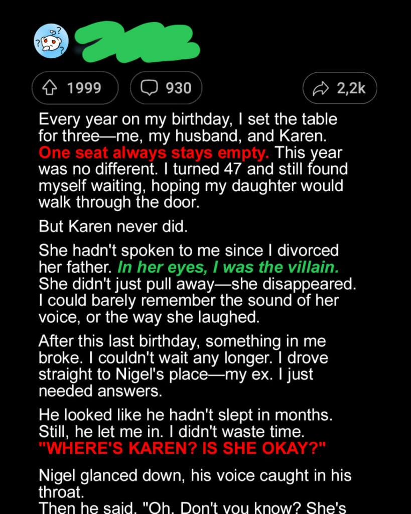 The candles flickered over a table set for three. My 47th birthday, once joyful, now marked silence. For two years, my daughter Karen hadn’t spoken to me. Still, I set her plate. “Just in case,” I told Brad, my husband. Dinner was quiet, haunted by her absence. Afterward, I tried calling—no answer, again. Then, a knock. Nigel stood there, envelope in hand. A letter from Karen. Apologizing. Missing me. Inviting me. Tears blurred my vision as I read her words. I held hope in my hands. “I have to see her,” I whispered. Brad didn’t hesitate. “Then let’s book the flight.”