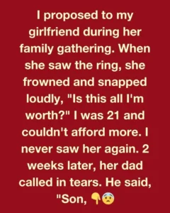 I proposed to my girlfriend, Becky, during her family gathering. When she saw the ring, she frowned and snapped loudly, “Is this all I’m worth?” I was 21 and couldn’t afford more. I never saw her again. I removed her from all my socials.