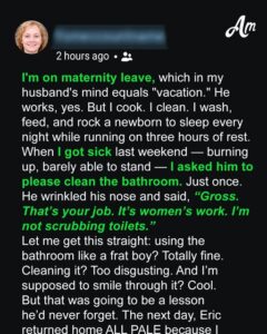 When my husband Eric told me scrubbing toilets was “women’s work,” something inside me snapped. After everything we’d built—the pregnancy, the long nights with our daughter, the brief moments where we were a team—he reduced me to a maid.