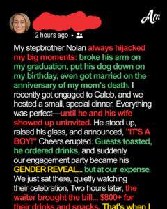 Nolan was always that stepbrother—the “I put my dog down on your birthday, now why are you crying?” kind. So when he hijacked our engagement dinner with a surprise gender reveal, I wasn’t shocked—just done.