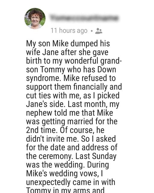 My son went from being a young husband and father to a cheater and absent father. When my grandson was born with Down syndrome, Mike took it upon himself to ruin his relationship with Tommy’s mother, Jane. And then he left. Only for me to find out that he is marrying again.