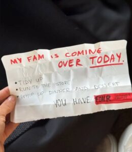 I was enjoying a peaceful Saturday morning when my husband, Alex, strolled in and casually announced, “My family’s coming in four hours. Could you tidy up, shop, cook, and make dessert?” Then he handed me a checklist—of tasks only for me—while he relaxed on the couch like royalty. It wasn’t the first time he pulled this stunt, but something snapped in me that day. I realized I was done being his unpaid hostess on call.
