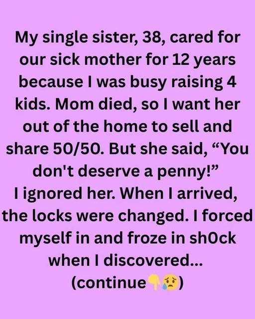 When our mom died, I expected to sell the house and split it with my sister, Dena, who had cared for her for 12 years while I raised four kids. But Dena had renovated the place—and changed the locks. Shocked, I found out Mom left her the house in her will. At first, I was furious. But over time, I saw the truth: Dena had sacrificed everything. Slowly, we rebuilt trust. She even offered me the guesthouse out back. Now we run a caregiver support center together from the home she once guarded fiercely. I told her I didn’t deserve half, and she replied, “It wasn’t about the house—it was about someone finally seeing me.” I see her now. And I’m proud of her. If you’re holding onto resentment or guilt with someone you love, don’t wait. Reach out. Healing doesn’t start with time—it starts when you finally show up.