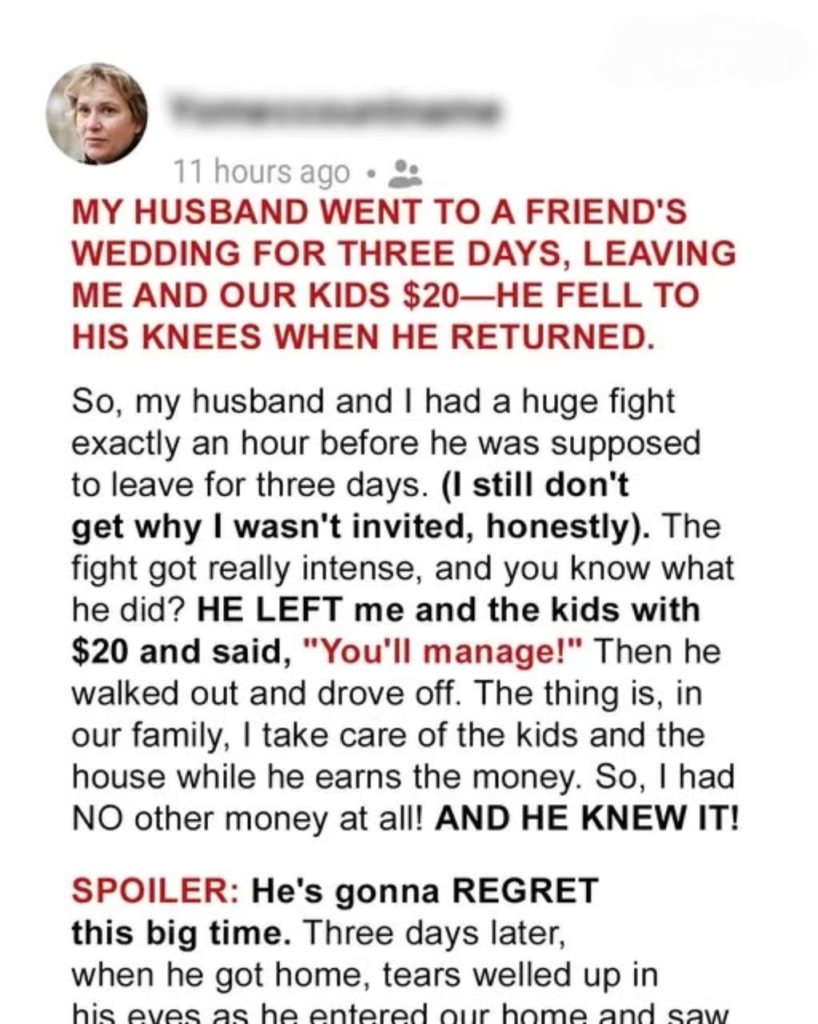 I’m Iris—a stay-at-home mom to two wild, wonderful kids. My husband, Paul, works full-time. He’s a good provider, but lately, he’s been emotionally absent. The spark we had was fading fast. One day, he announced he’d be leaving for a three-day wedding trip—with only a $20 bill for me and the kids. I was stunned. “No food, no help, just this?” I asked.