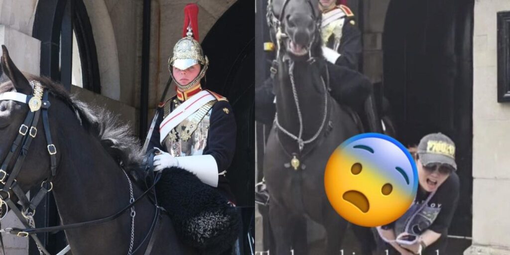 A visitor has gained widespread attention on the internet when a video showed her getting too close to a King’s Guard horse and suffering a rather serious injury.