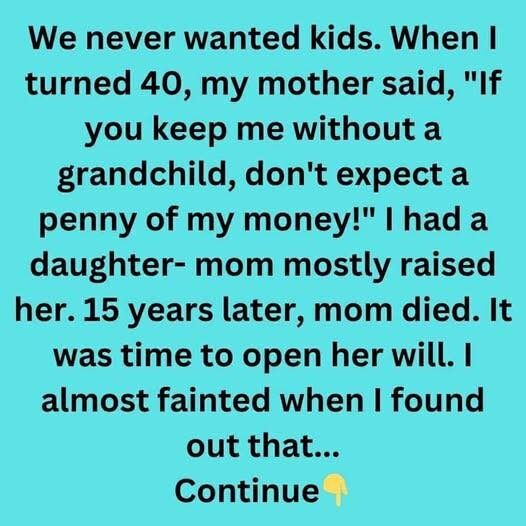 My husband and I never wanted kids, but when I turned 40, my mom threatened to disinherit me if I didn’t give her a grandchild. I had a daughter, and my mom mostly raised her. After she died 15 years later, I found her valuables gone and a note in her jewelry box that said,