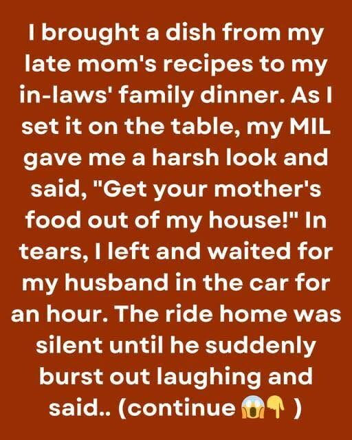 As I set it on the table, my MIL gave me a harsh look and said, “Get your mother’s food out of my house!” In tears, I left and waited for my husband in the car for an hour.