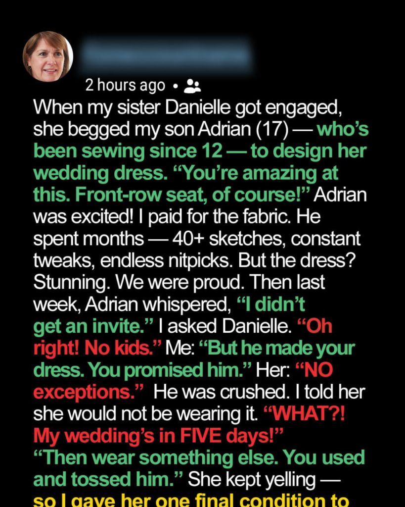 When my sister Danielle got engaged, she begged my 17-year-old son, Adrian, to design and sew her wedding dress. For eight months, he poured his soul into it—sketches, beadwork, late nights at his sewing machine—believing her promise that he’d have a front-row seat on her big day.