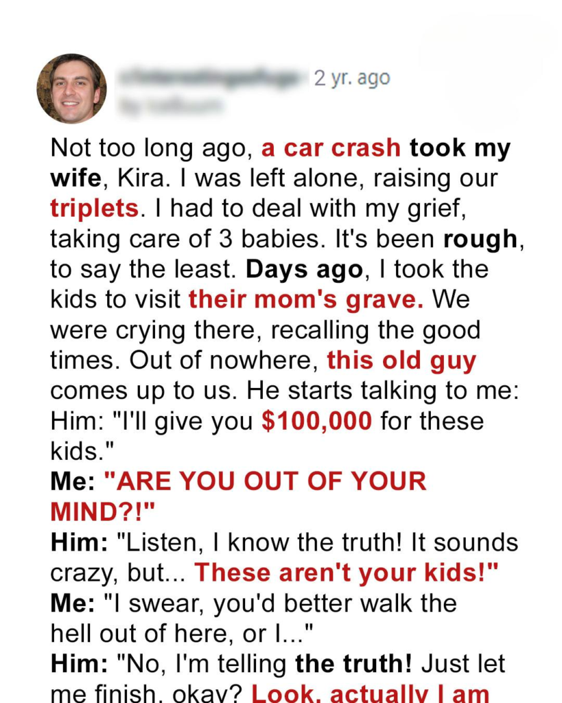 For a year after his wife Kyra’s death, Jordan Fox raised their triplets alone, pouring everything into being both mother and father. On her first death anniversary, he took the boys to her grave—only to find a stranger waiting.The man, Denis, claimed to be the children’s real father, offering Jordan $100,000 to hand them over. Jordan refused, but Denis knew intimate details about Kyra—including a scar she had never mentioned—which left Jordan shaken.