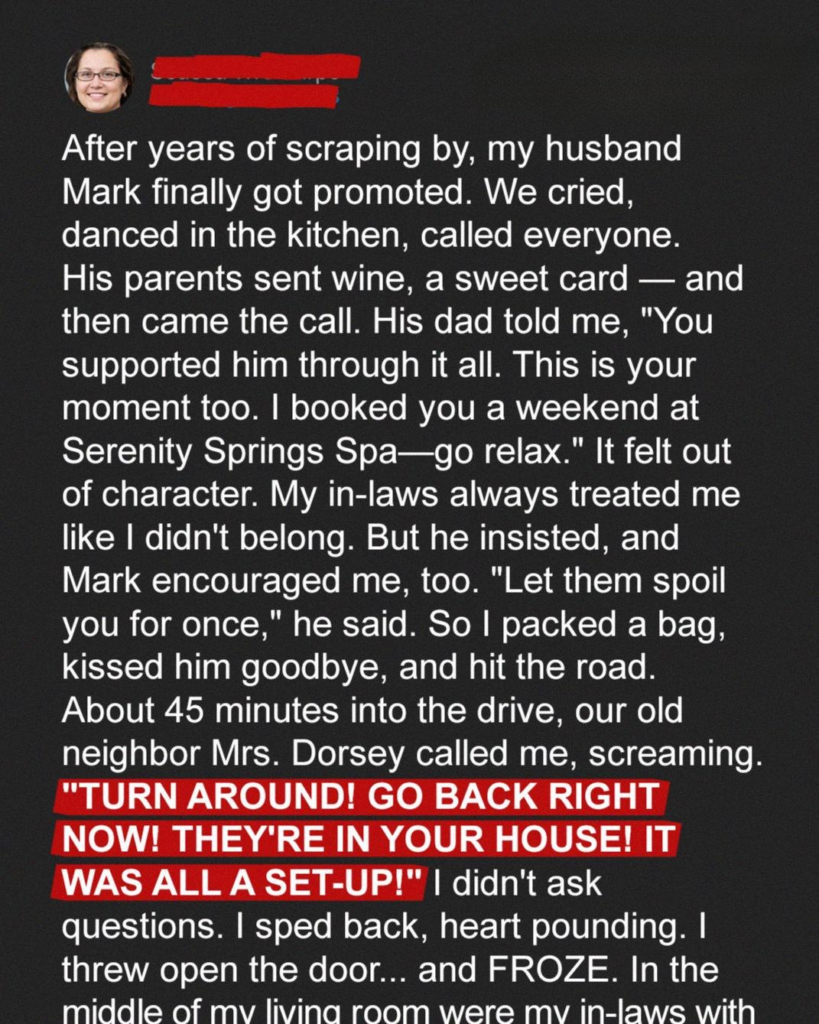 For three years, my in-laws barely tolerated me. I wasn’t “their kind” — no country clubs or trust funds, just a teacher who married their precious son, Mark. Then one day, my father-in-law, Rob, called with an unexpected offer: an all-expenses-paid weekend at a luxury spa. Mark encouraged me to go, saying they were finally showing appreciation now that he’d landed a high-paying job. Halfway to the resort, my elderly neighbor, Mrs. Dorsey, called — panicked.
