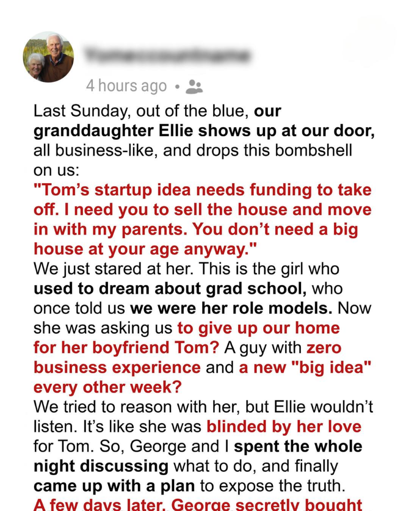 Mary and George adored their granddaughter Ellie from the moment she was born. They spoiled her, supported her, and dreamed of seeing her off to college. But one Sunday morning, Ellie arrived with a shocking request — they should sell their house, move in with her parents, and give the money to her boyfriend Tom for his “big renewable energy startup.”