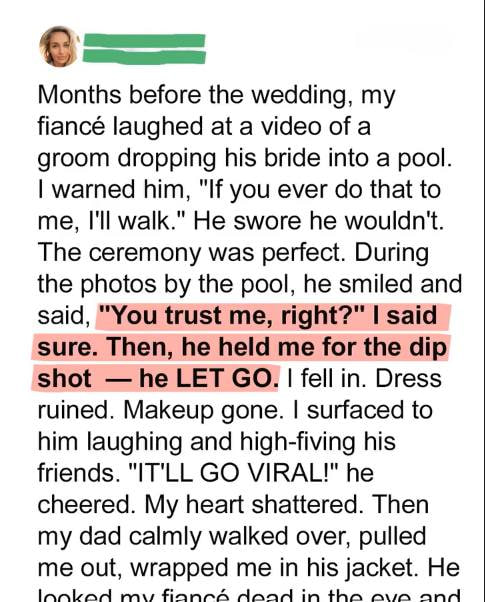 After the vows, during a private photo session by the pool, Dylan broke that promise. Without warning, he shoved her in. The gown ballooned in the water, her veil tangled, guests gasped — and Dylan laughed, high-fiving his groomsmen.