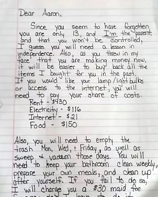 After a heated argument over chores, Aaron declared he could do whatever he wanted. Instead of yelling, Heidi wrote a formal “bill” for rent, utilities, food, and maid service—taping it to his door. It ended with: “If you’d rather be my child again instead of a roommate, we can renegotiate terms.”