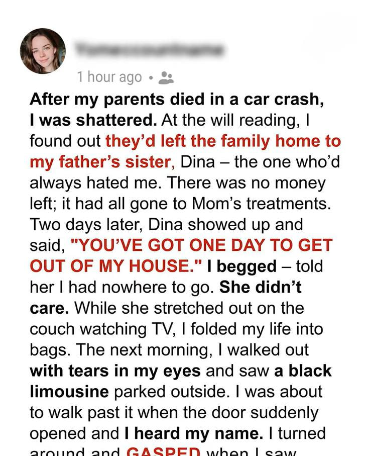 After my parents died unexpectedly, I was devastated. At 19, I was left to grieve alone in the only home I had ever known. Things got worse when my Aunt Dina, someone who had barely been present in our lives, showed up at the will reading. To my shock, the house had supposedly been left to her. Days later, she arrived at the front door and coldly told me to pack up and leave. I had nowhere to go, but she didn’t care—she was already making herself comfortable on our couch.