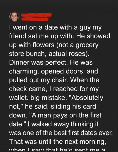 At first, Eric seemed like a rom-com lead—thoughtful texts, fresh roses, perfect manners. Our dinner was fun and easy: we laughed about podcasts, debated fridge etiquette, and he even gave me a “good luck” keychain. I thought I’d met someone genuine.