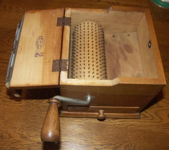 from: Madeleine Levaggi: “This has been a toughie to identify. Before you tell me it’s a cotton gin, know that I wrote the cotton museum of South Carolina and they informed me that it was not a cotton gin. The logo says Brevetto Ferrari 2. Any ideas?”