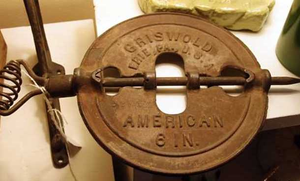 3) This iron piece has stamping on both sides. The iron plate swivels along an iron post, which has a spiraled end. Do you have any clue?