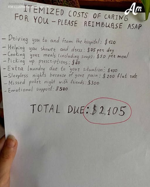 In Daniel’s precise accountant handwriting, every act of care had a price: driving me to the hospital ($120), helping me shower ($75/day), cooking meals ($50 each), emotional support ($500). At the bottom, circled in red: TOTAL DUE $2,105.