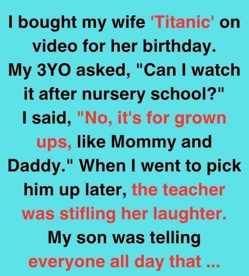 Later that day, his teacher was nearly in tears from laughing as she explained how Max had spent the entire morning telling everyone, “Mommy and Daddy watch Titanic alone at night because it’s for grown-ups only.”