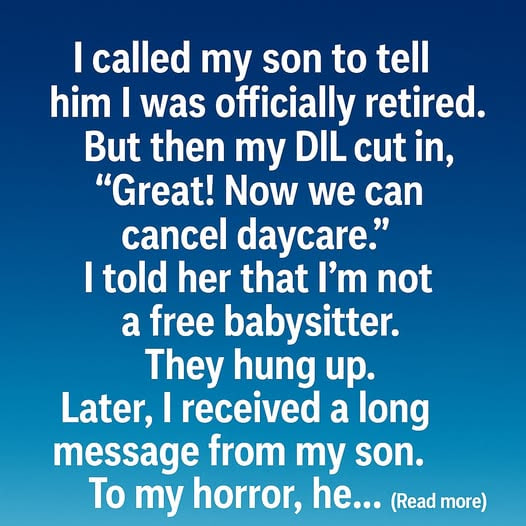 I retired on a Tuesday—it felt mischievous not to wait for Friday. My coworkers gave me a hammock card, I hugged the people I’d seen for decades, and drove home blasting the radio, already planning watercolor classes, train trips, and lazy mornings. When I called my son to announce my freedom, my daughter-in-law’s voice cut in: “Perfect timing—we can cancel daycare!” I froze. My vision of blank calendars and long lunches collapsed into drop-offs at 7:45 a.m.