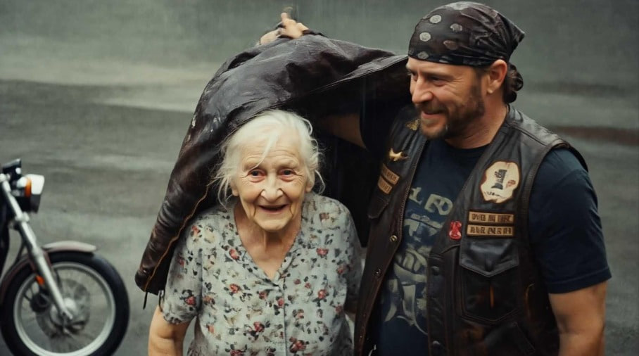 Rain poured down, drenching me. That’s when a motorcycle pulled up, its rider rugged, tattooed, yet unexpectedly kind. He shielded me with his jacket and asked gently, “You alright, ma’am?” I told him everything. He didn’t flinch—just nodded and said, “Climb on. I know where we need to go.”