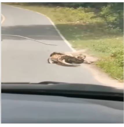 A passerby, noticing the commotion, stopped his car and discovered the python tightly wrapped around the animal. Instead of retreating to safety, he chose courage. Grabbing a sturdy stick, he rushed forward, striking the ground and prying at the snake’s body while keeping clear of its head. Each attempt carried risk, as the python’s grip only tightened.